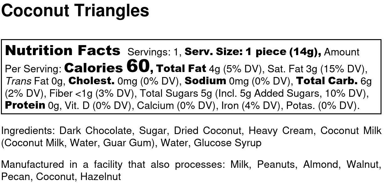 The Coconut Triangles are one of our favorite holiday and everyday treats. A sweet, moist coconut center covered in a semi-sweet Belgian chocolate coating. Includes simple and fresh ingredients. These are a huge hit with everyone.